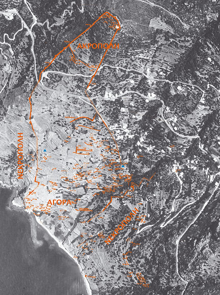 ![]() Άποψη συγκροτήματος πέντε αναλημματικών τοίχων, περίπου στο μέσο της αρχαίας πόλης | ![]() Κελλί (αγροτικό κτίσμα) στην περιοχή της αγοράς της αρχαίας πόλης (τέλη 19ου αι.) | ![]() |